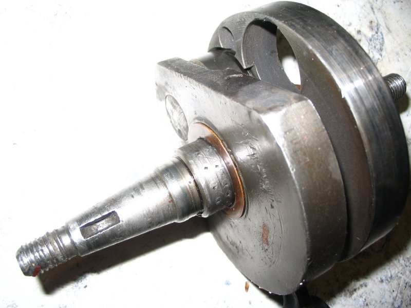 | In these two pictures it is possible to see the damage caused by the crankshaft making contact with the crankcase at the level of the intake valve (left). This damage was caused by worn crank bearings that allow the shaft to wobble and hit the side of the case. The shaft itself was worn at the bearings mounting collars and it had been indented with a pointy instrument to increase the contact surface to take up the play developed after years of operation. The picture also shows damage to the case all around the bearing caused by the unstable shaft moving irregularly. |