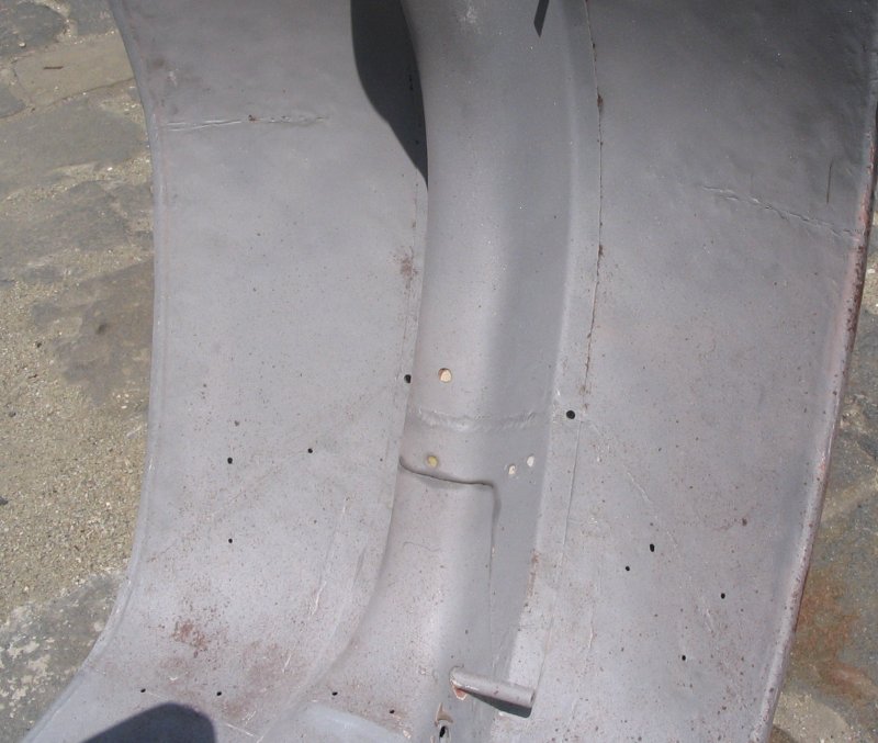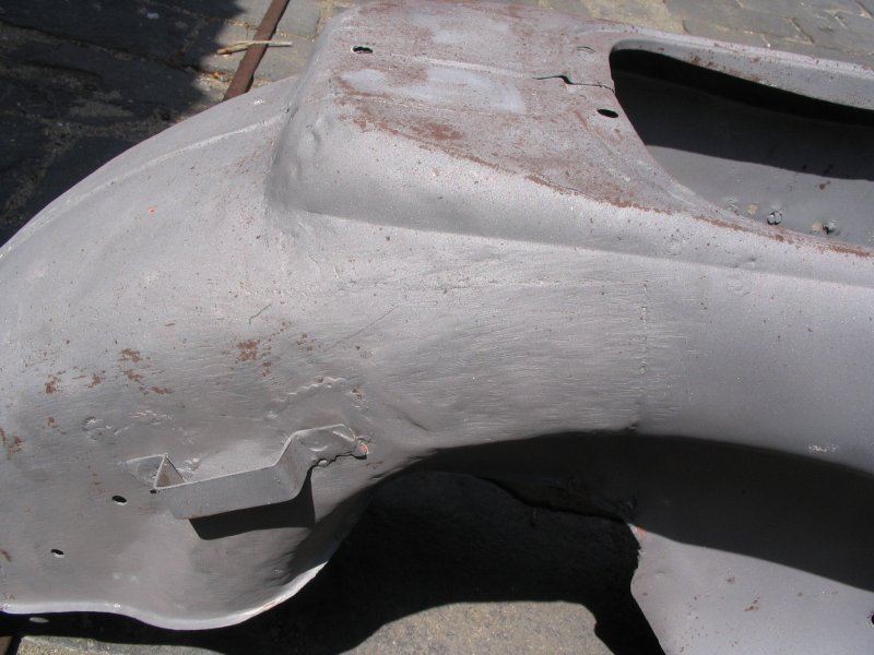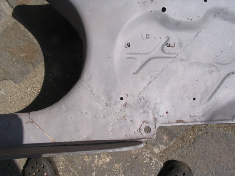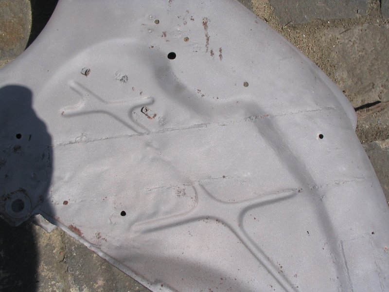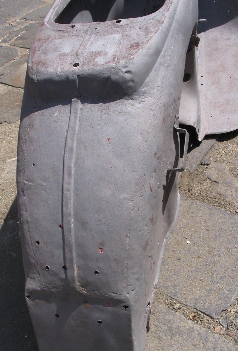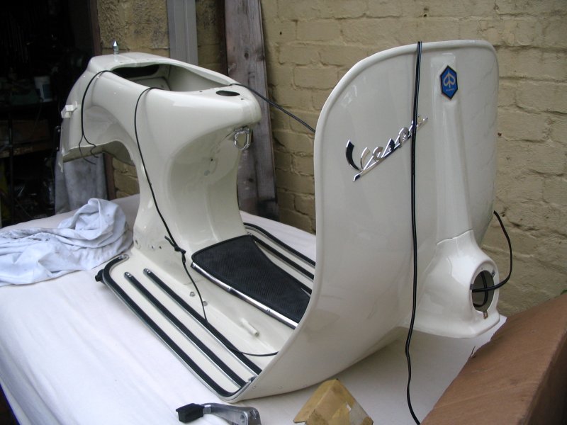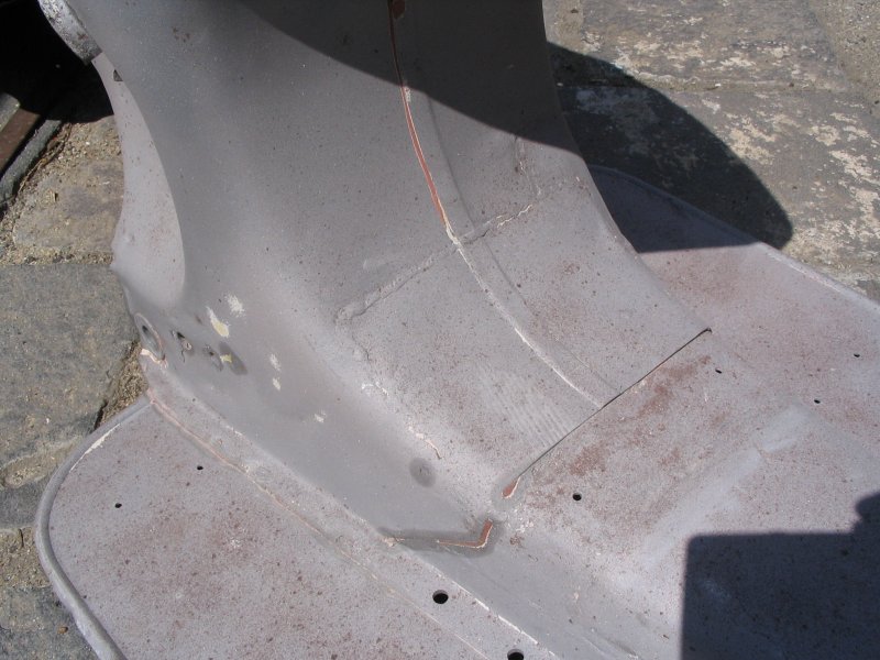 Well....this was a very expensive exercise but the Vespa has now got a PX engine and many more years of happy motoring ahead Stop the press!!!!!! Something new has happened.....Read on After a couple of weeks the owner decided to have the Vespa re-sprayed in new colours to suit his business. The scooter was completely dismantled and the frame was taken to the Motorcycle Paint Clinic for a complete restoration of the whole body. When the frame came back from the sandblasters we discovered that the body had been built by welding together pieces from 5 different Vespas. Here are the pictures of our new discovery |